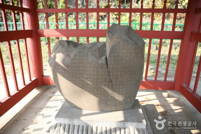 This site features a stone stele that dates back to the 6th century, erected by King Jinheung, the 24th king of the Silla Kingdom. The monument is broken into three parts, with the lower sections inscribed with 280 characters detailing names, places, and titles from that era. The upper part has around 100 letters, although most of them are now hard to read.